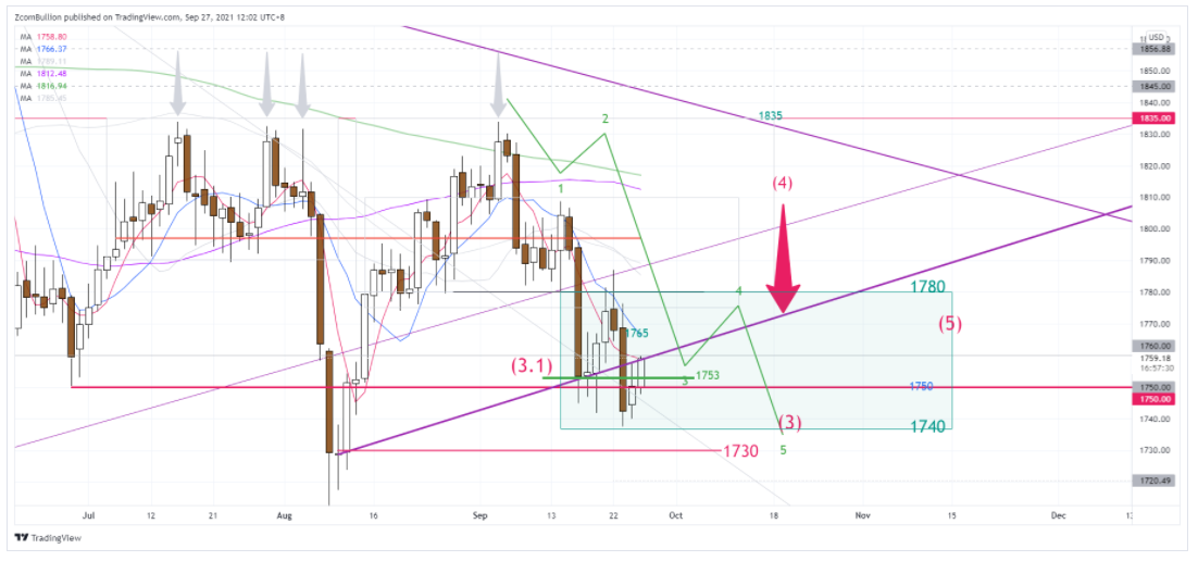 日線圖 – 整體黃金在過去1週仍未能成功突破1750支持,同時下降趨勢(3)在金價升穿下降 “浪3” 的頂部1753阻力(3.1)後,已正式完結。初步金價將進入1740-1780區間橫行,短線暫時受阻於趨勢線(4)。