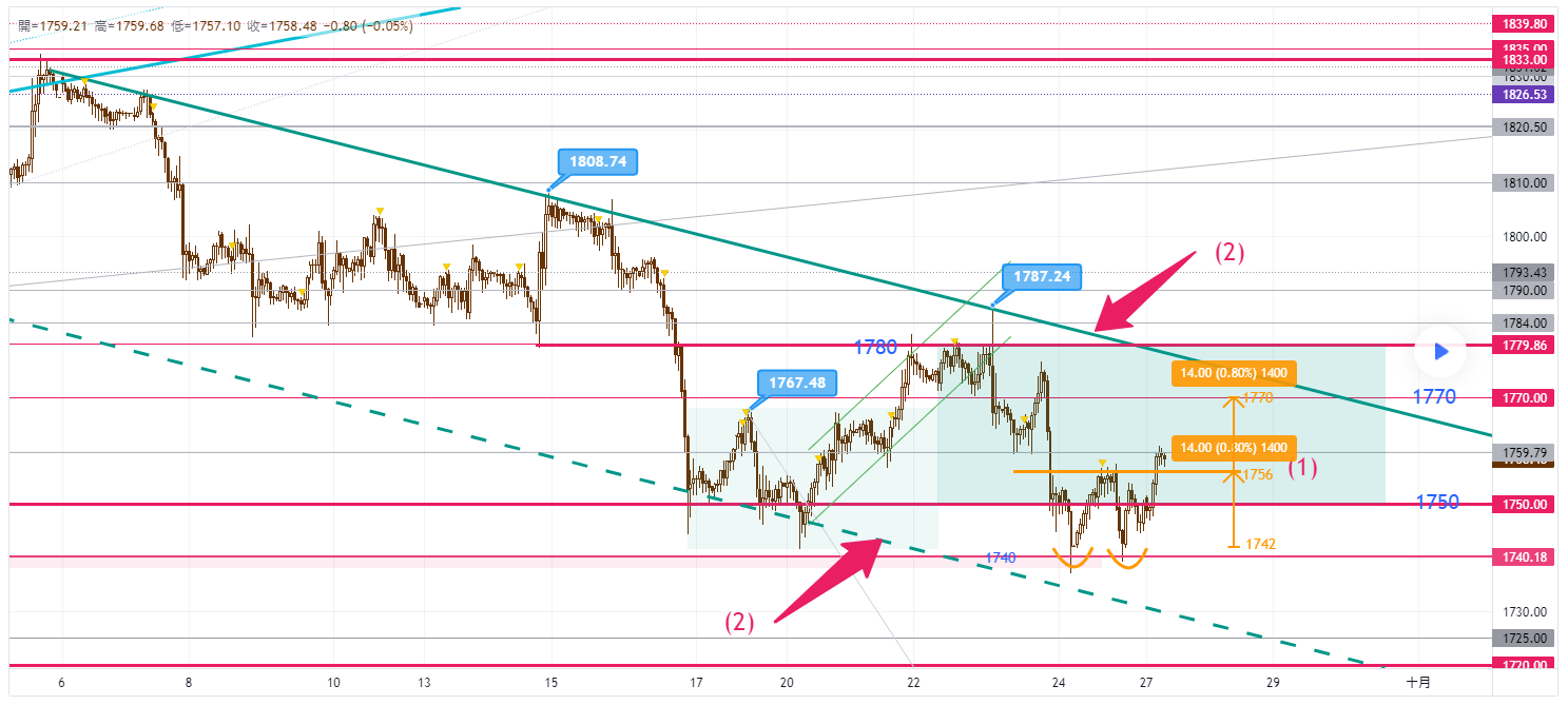 正如上週五所講,1小時圖金價仍在下降通道(2)當中,整體金價在上週尾段已在1740附近找到支持。在過去48小時,黃金在1小時圖形成了小型雙底形態(1),今早亞盤已成功突破頸線1756,短線回抽後,以1:1計算,目標會在1770附近。