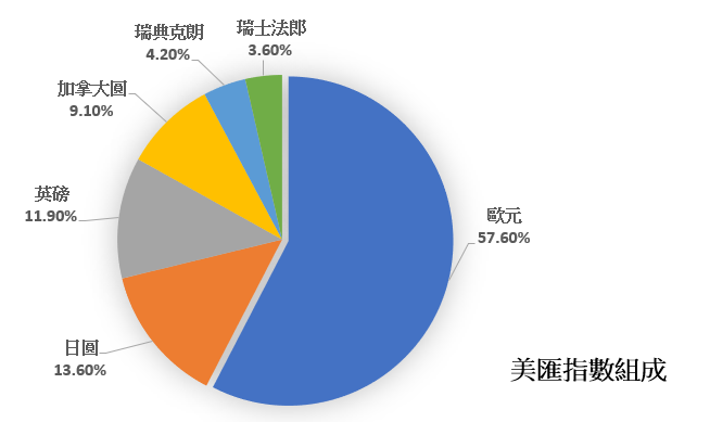 美元指數(The U.S. Dollar Index)由6種不是美元的貨幣幾何加權平均組成,這6大貨幣分別是歐元(EUR)佔指數權重的57.6%、日圓13.6%、英鎊(GBP)佔11.9%、加拿大元(CAD)為9.1%;瑞典克朗(SEK)佔4.2%、瑞士法郎(CHF)佔3.6%,作為全球判斷美元強弱的標準,當美元指數變弱的時候,代表美元也變弱,也代表美元變便宜了。它通過計算美元和對選定的一攬子貨幣的綜合的變化率,來衡量美元的強弱程度,從而間接反映美國的出口競爭能力和進口成本的變動情況。歐盟單一貨幣成立後,它取代了德國馬克等幾種歐洲國家貨幣。