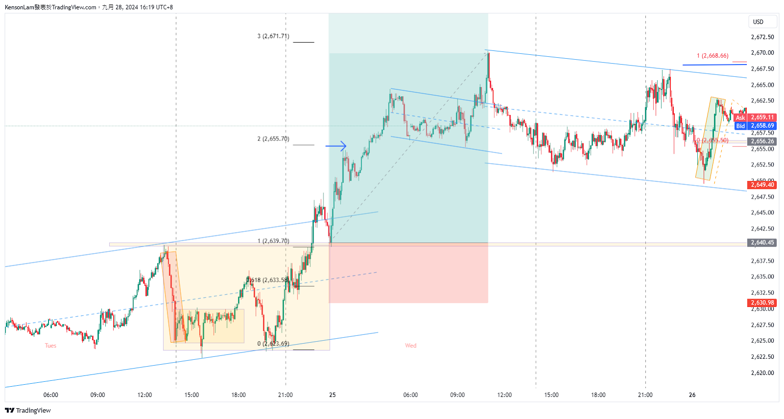 5M 圖看到週二美盤時段升穿橫行區後,橫行頂是個不錯的入市位,雖然沒有0.618的有利因素,但因為止損近,跌穿橫行中線就代表睇錯方向,而向上有機會去到2700才有較大回調,值搏率較高,頭關先看橫行1:1,然後破上升結構再減倉,一路推上去。