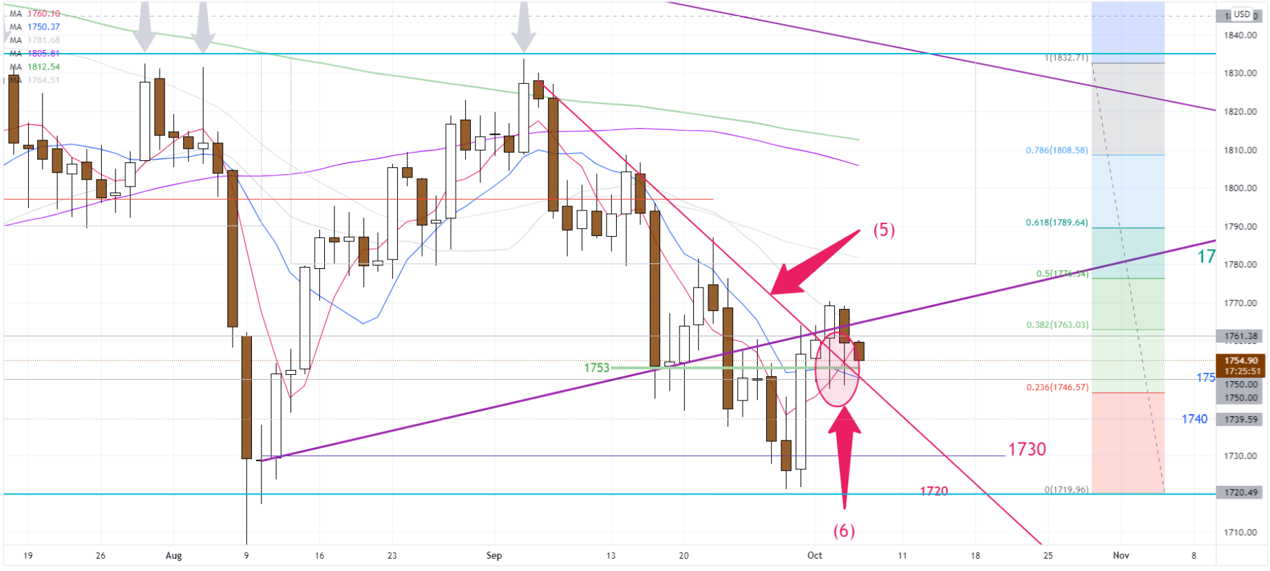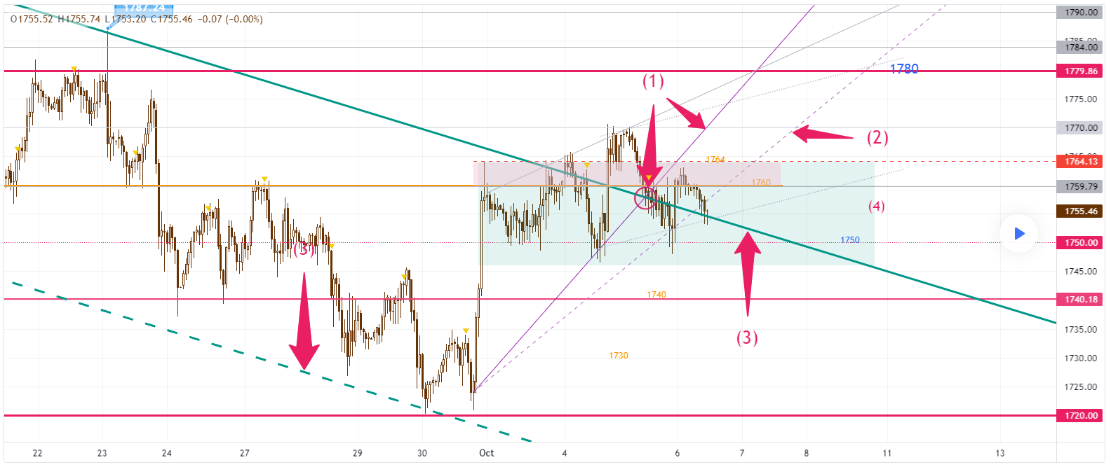 黃金繼續在早前的下降通道(3)阻力線徘徊,未能承勢沖高。昨晚的低位1748,在1小時圖上已形成新的短線上升支線(2),自9月30日開始的上升趨勢已由趨勢線(1)放緩至趨勢線(2),反映上升動力已經放慢。如昨日所講,未來24小時金價須再試高位,否則上週的上升動力將會耗盡,短線將在1746-1764區間(4)沉澱。